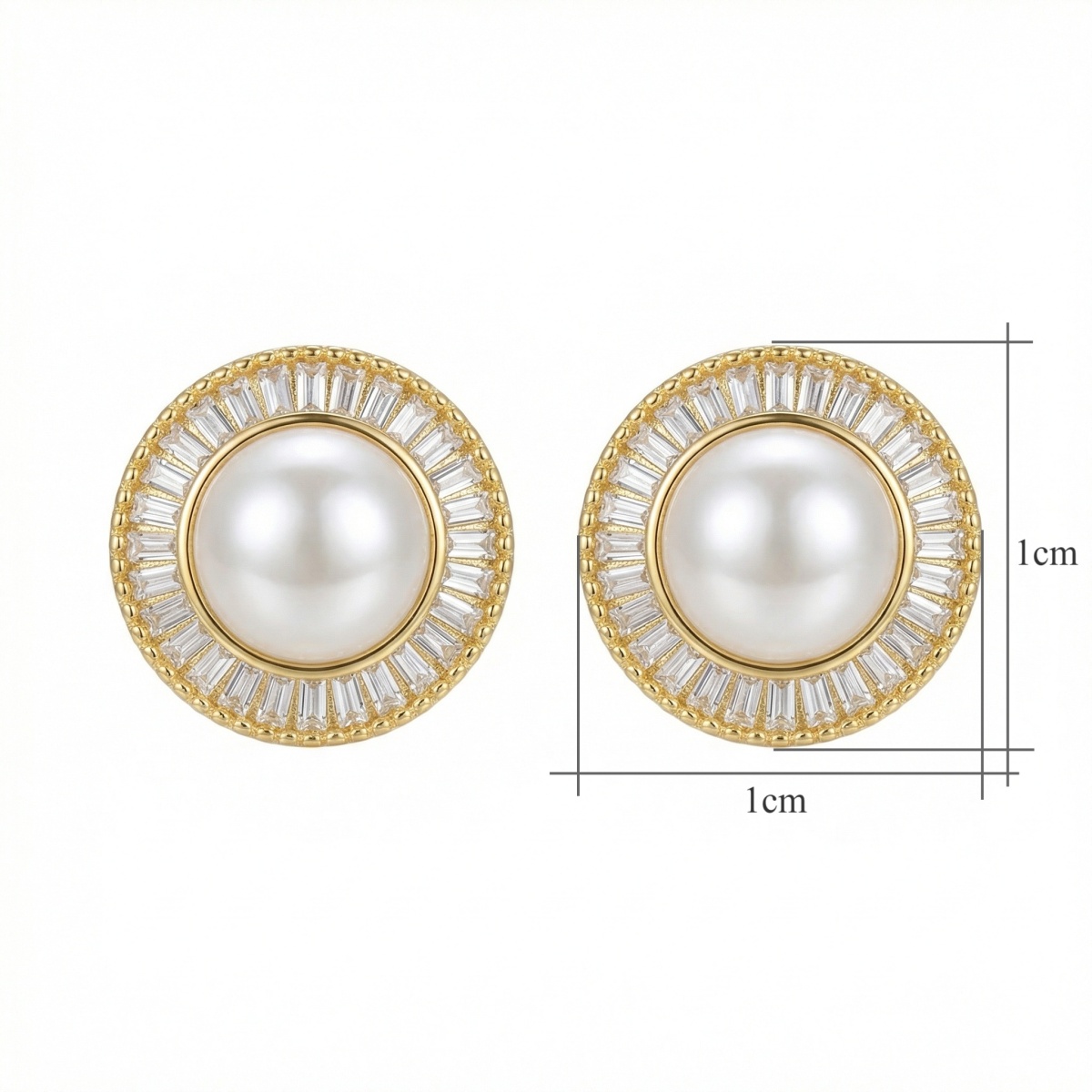These stunning stud earrings showcase a timeless design that radiates sophistication. Each piece features a large, lustrous white pearl at its heart, carefully polished to a brilliant sheen. Surrounding the center pearl is a breathtaking halo of rectangular baguette-cut crystals, arranged in a sunburst pattern to catch and reflect light from every angle. The warm yellow metal setting provides a beautiful contrast, enhancing the natural glow of the pearls. Perfect for both formal occasions and elevating everyday attire, these earrings offer a blend of vintage charm and modern elegance. Whether as a thoughtful gift for a loved one or a special treat for yourself, these exquisite accessories are a must-have addition to any jewelry collection. | Brand: jewelryodm