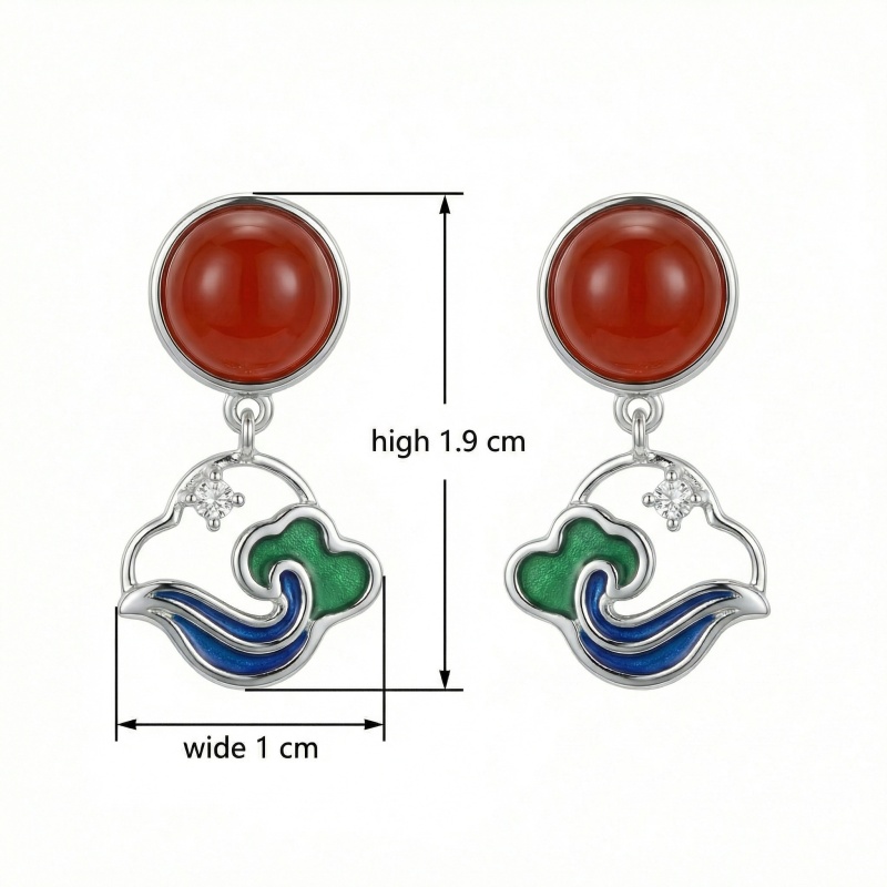 These exquisite drop earrings feature a captivating blend of traditional Chinese aesthetics and modern craftsmanship. Each earring showcases a vibrant, round red carnelian cabochon set in polished sterling silver. Suspended from the stud is an intricate, wave-inspired cloud charm, beautifully detailed with emerald green and deep blue enamel in a style reminiscent of classic cloisonné. A single, sparkling clear crystal is delicately nested within the silver frame of the cloud, adding a subtle touch of brilliance. The combination of rich red, oceanic blues, and lush greens creates a striking visual contrast, making these earrings a meaningful and stylish accessory. Perfectly capturing the essence of auspicious cloud motifs, these earrings symbolize good fortune and elegance, making them a unique statement piece for any jewelry collection. | Brand: jewelryodm