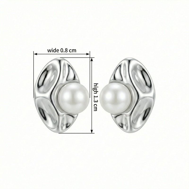 This pair of earrings showcases a sophisticated fusion of modern design and classic elegance. Each earring features a polished silver-tone base with a unique, organic, and wavy texture that beautifully catches the light. The sculptural metal frame cradles a perfectly round, lustrous white pearl at its center, creating a striking contrast between the fluid, hammered-style metalwork and the soft, iridescent glow of the gemstone. These studs are designed with a contemporary aesthetic, making them a versatile accessory for both formal occasions and elevated everyday wear. Their minimalist yet artistic form adds a touch of refined luxury to any look. The high-quality finish and meticulous craftsmanship ensure a timeless appeal, making these earrings an exquisite gift or a stylish addition to a modern jewelry collection. | Brand: jewelryodm