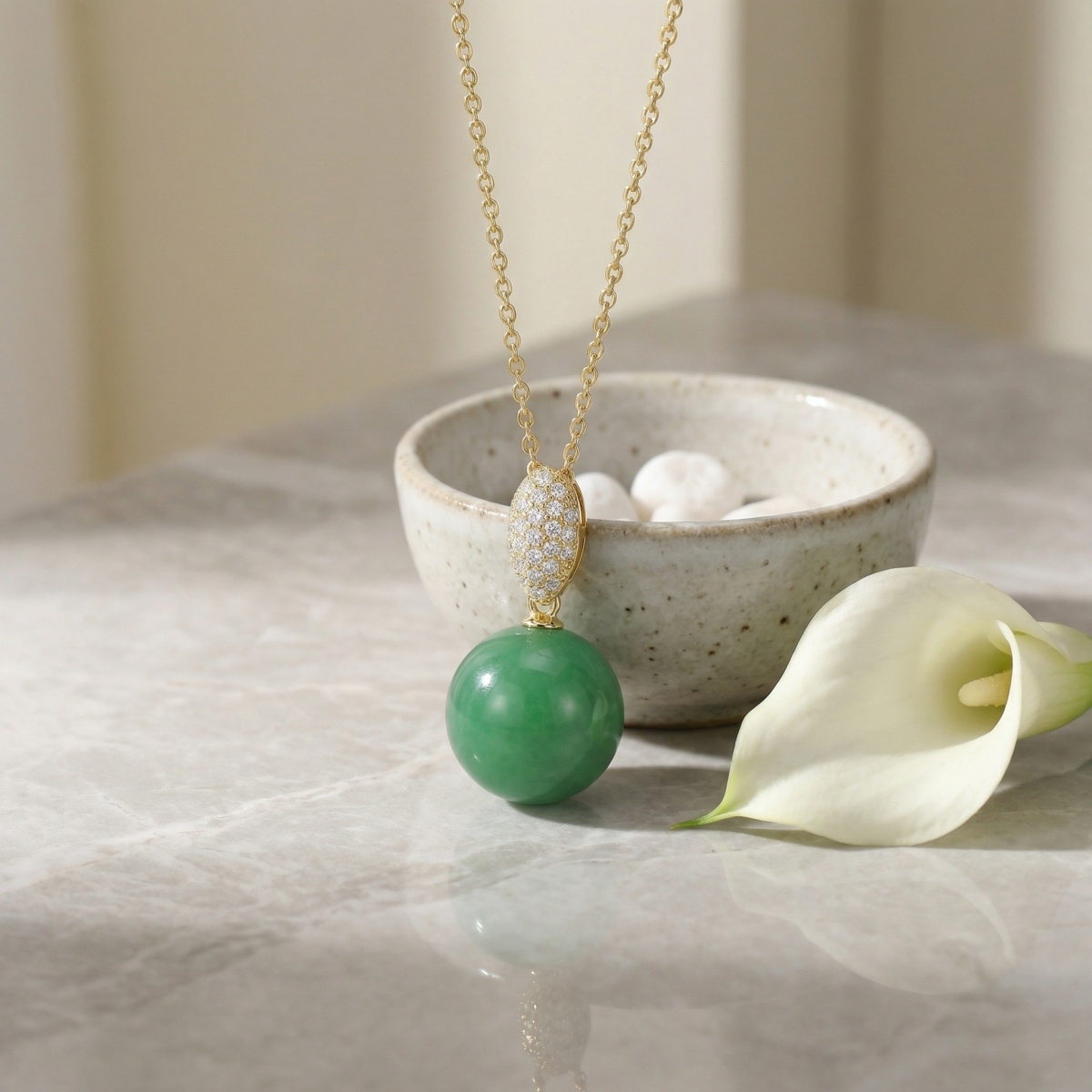 This exquisite necklace features a stunning, perfectly polished green jade sphere that radiates a vibrant emerald hue. The pendant is elegantly suspended from a teardrop-shaped bail encrusted with a shimmering array of round-cut diamonds, adding a touch of luxury and brilliance to the design. Hanging gracefully from a delicate link chain, this piece combines the timeless beauty of fine gemstones with contemporary sophistication. The rich green of the jadeite symbolizes prosperity and harmony, making it a meaningful addition to any jewelry collection. Perfectly balanced and visually striking, this pendant necklace is suitable for both special occasions and refined daily wear. Its classic silhouette ensures it remains a cherished heirloom for years to come. | Brand: jewelryodm