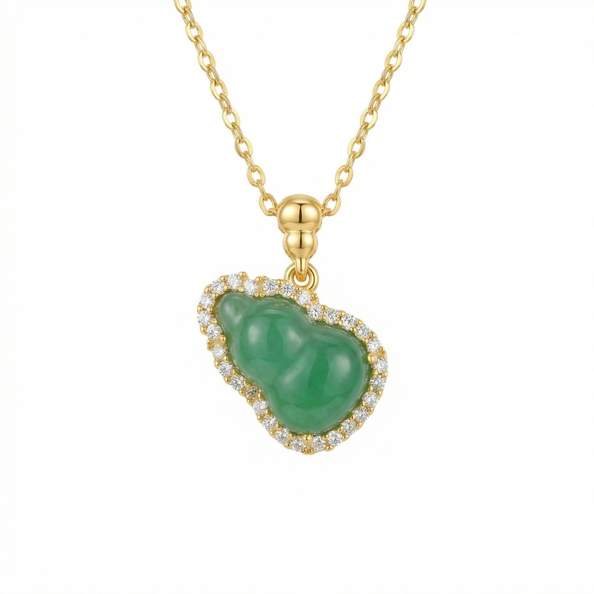 This exquisite necklace features a vibrant green jade pendant, meticulously carved into a traditional Hulu (calabash) shape, representing longevity and prosperity. The smooth, translucent jade center is elegantly framed by a radiant halo of shimmering clear stones that catch the light beautifully. Suspended from a delicate link chain with a polished metallic finish, this piece blends timeless cultural symbolism with modern sophisticated style. Perfect for special occasions or daily wear, it serves as a meaningful gift or a stunning addition to any jewelry collection. The fine craftsmanship ensures a high-shine luster that perfectly complements the rich emerald hues of the stone. | Brand: jewelryodm