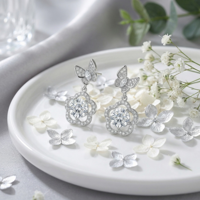 These stunning drop earrings feature a captivating nature-inspired design, combining the grace of a butterfly with the beauty of a flower. The upper portion consists of an intricately detailed butterfly stud, adorned with pavé-set stones and a central marquise-cut gem. Dangling gracefully below is a brilliant floral pendant. At its heart sits a large, round brilliant-cut stone, encircled by a delicate five-petal halo shimmering with smaller crystals. Crafted with a polished silver-tone finish, these earrings offer exceptional sparkle and sophisticated elegance. Perfect for weddings, formal occasions, or as a thoughtful gift, they add a touch of whimsical luxury to any ensemble. Their timeless appeal and brilliant craftsmanship make them a versatile yet statement-making addition to any jewelry collection. | Brand: jewelryodm