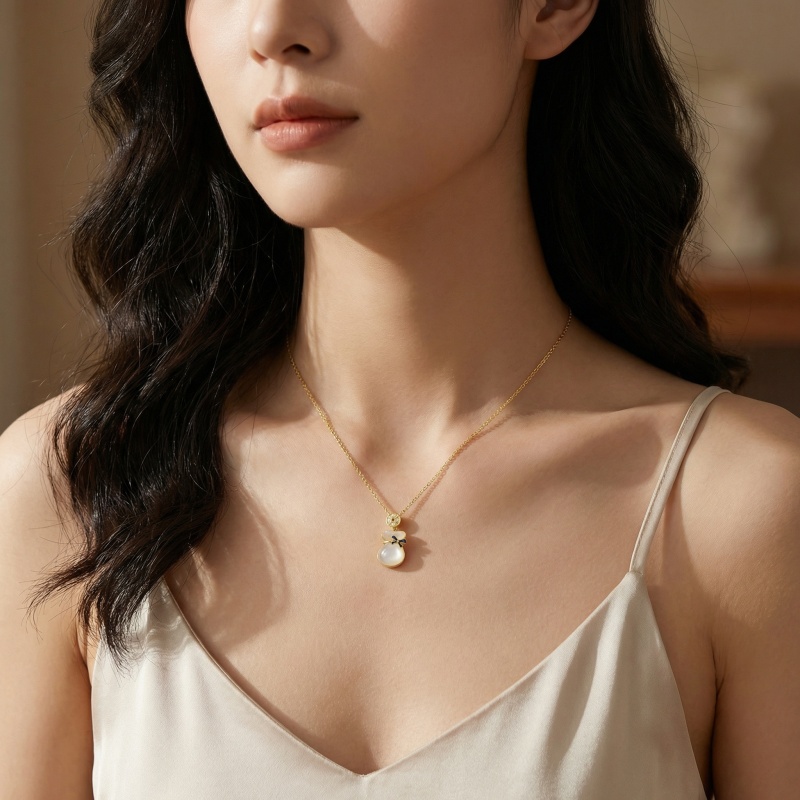 This exquisite necklace features a charming money bag pendant, meticulously crafted to symbolize wealth and eternal prosperity. The central piece is a smooth, milky white gemstone shaped like a traditional lucky pouch, framed by a delicate metallic border. A vibrant blue enamel bow adds a touch of playful elegance, cinching the pouch with style. Suspended above is a circular lucky coin motif, intricately detailed and accented with shimmering stones that catch the light beautifully. Hanging from a classic link chain, this piece blends traditional Eastern symbolism with a modern aesthetic. Whether as a personal talisman or a thoughtful gift, this necklace is designed to bring a sense of abundance and grace to any ensemble. The contrasting textures of the polished white stone and the brilliant blue accents make it a standout accessory for any occasion. | Brand: jewelryodm