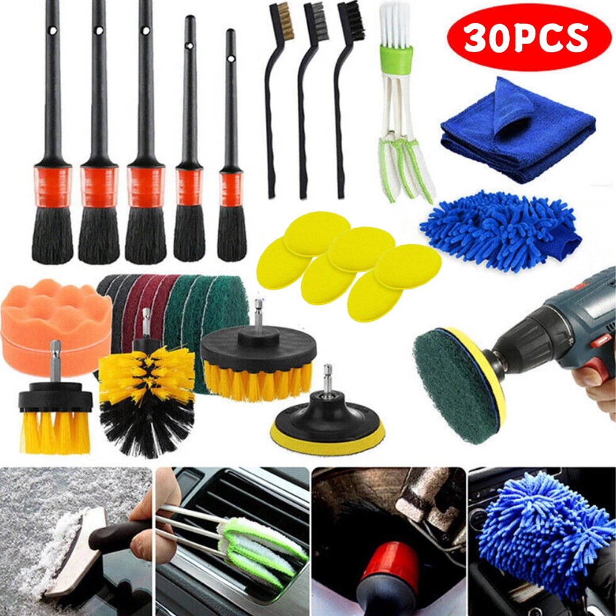 【Ideal Detail Brush Set】30 car wash detailing kits including 5 different sizes of high-composite filament detail brushes, 3 branch line brushes, 2 thickness high-elastic sponges, 1 air-conditioning outlet brush, and 1 pair of double-sided microfiber car wash gloves, 1 absorbent car cleaning cloth, 3 sets of electric drill brushes, 10 4-inch pads, 2 4-inch orange sponges, 1 4-inch tray, and 1 15cm extension rod.