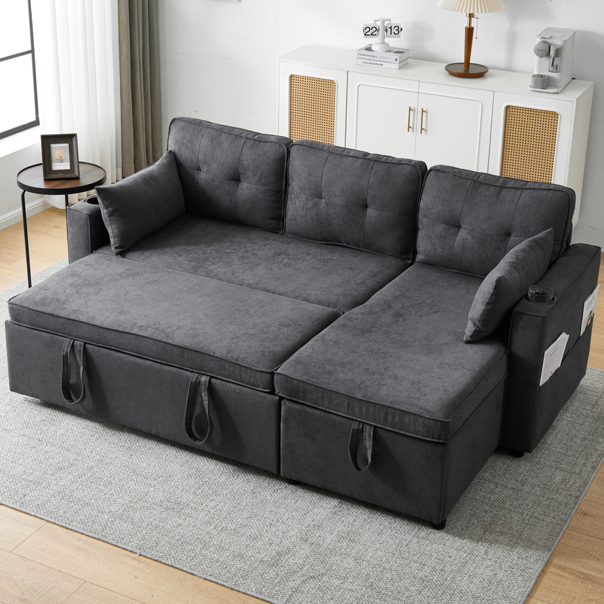 Product Name:3-in-1 Convertible Sofa Bed with Internal Storage Chaise, L Shaped Sleeper Sofa Couches with Cup Holders, Pillows and Storage Pocket. Pullout Sectional Daybed for Living Room/Bedroom/Office, Grey