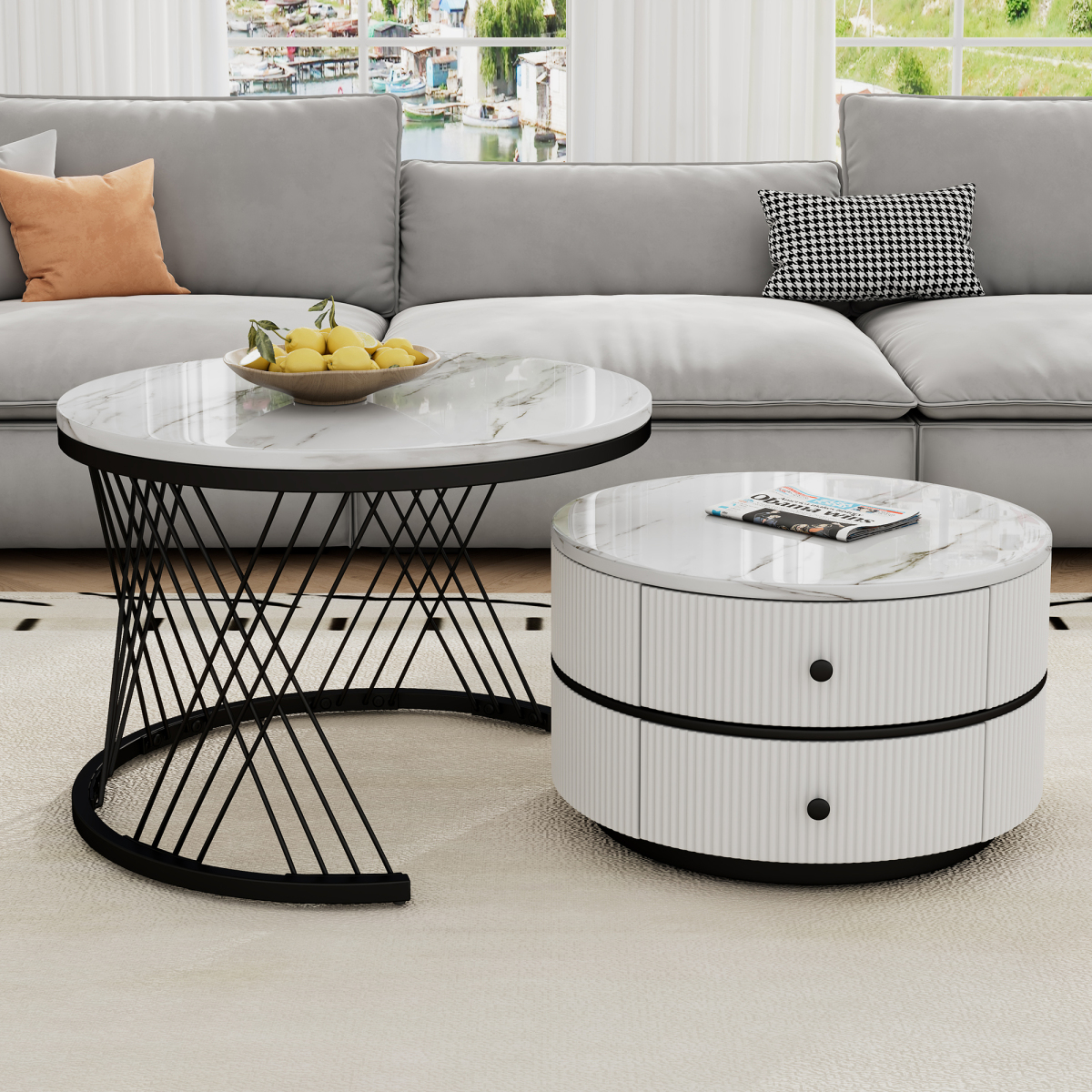 Product Name:High Gloss Round Nesting Coffee Table with Marble Top, End Table, White & Gold Nesting Coffee Table Set of 2 Center Table with Storage Drawers for Living Room