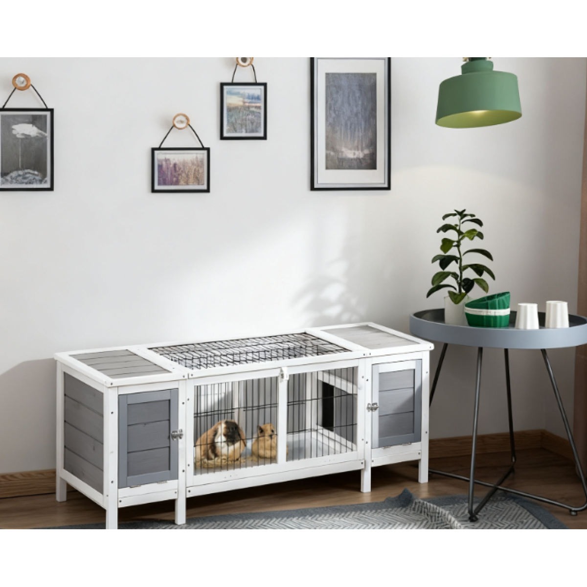 Features: - Multifunctional use, an extractable divider in the middle and two sides that can be used together or separately - The top of the running cage opens with a tray for easy cleaning. - Indoor use, concise deco makes it can be displayed in your home anywhere you like. - Assembly required Specification: - Color: White, Gray - Material: Fir Wood, Steel - Overall Size: 63.5" W x 20" D x 21" H - The Main Nest Size: 13.5" W x 19.25" D x 15.75" H - Door Size: 10.75" W x 12" H - Whole Middle Hutch Size: 36.6" W x 19.3" D x 15.7" H - Doorway Size: 7.75" W x 7.25" H - Bowl Size: Dia 4.25" x 1.25" H - Tray Size: 36.5" W x 18.5" H - Frame Size: 1.25"W x 0.75"T Package Includes: - 1 x Rabbit Hutch - 1 x Manual