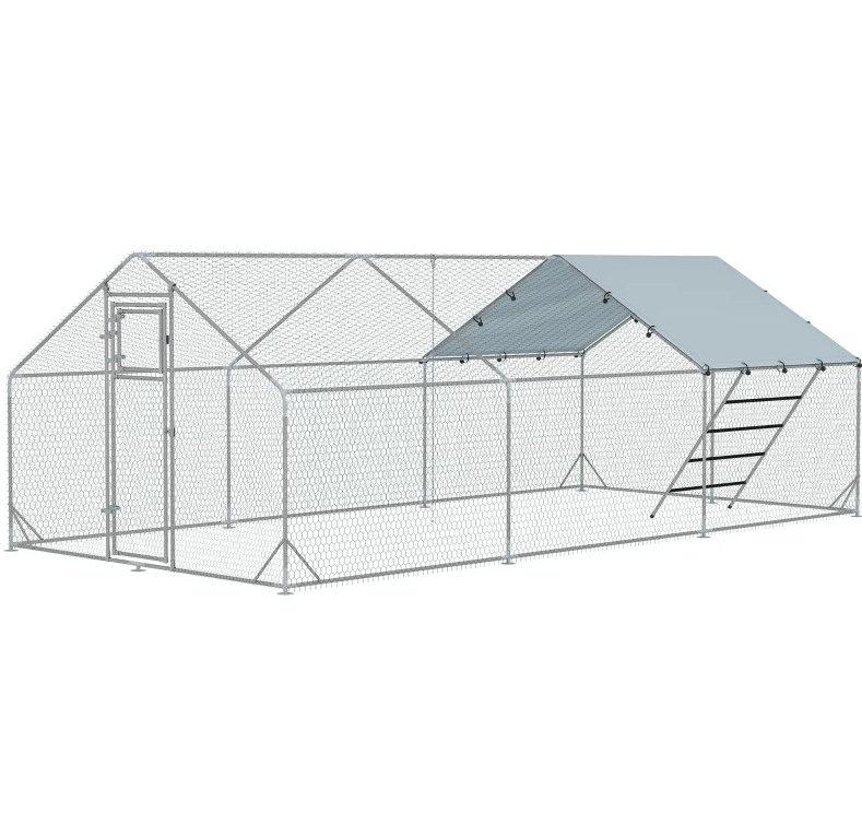 Features: - Spacious 194 sq. ft. area comfortably houses 18-24 chickens - Includes hanging feeder and 4-tier perches for comfort - Feeding door design prevents chickens from escaping - Galvanized steel and plastic-dipped mesh ensure durability - 420D Oxford fabric shields against UV rays and rain - Assembly requires two people, completed in 2.5 hours - Recommended for adding a coop, enhancing chicken warmth - Not only suitable for chicken, but also for rabbits, ducks, geese Specification: - Color: Silver - Material: Galvanized Steel Pipe, Steel Mesh, 420D Oxford Cloth - Overall Dimensions: 9.8'W x 19.7'D x 6.4'H - Top Cover: 137" L x 78.7" W - Large Door: 21.7" W x 63" H - Feeding Door: 17.3" W x 16.5" H - Mesh Grid: 1.6" L x 1" W - Perch: 55.1" L x 37.4" W, 9.8"(gap) - NOTE: Please remove the cover in adverse weather conditions Package Includes: - 1 x Chicken Run - 1 x Hanging Feeder - 1 x Perch - 1 x Manual