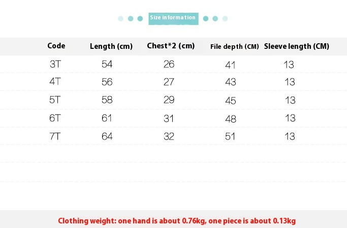 Size: 3T (recommended age 2-3 years old, height 75-90cm),4T (recommended age 3-4 years old, height 90-100cm),5t (recommended age 4-5 years old, height 100-110cm),6T (recommended age 5-6 years old, height 110-120cm),7T (recommended age 6-7 years old, height 120-130cm)