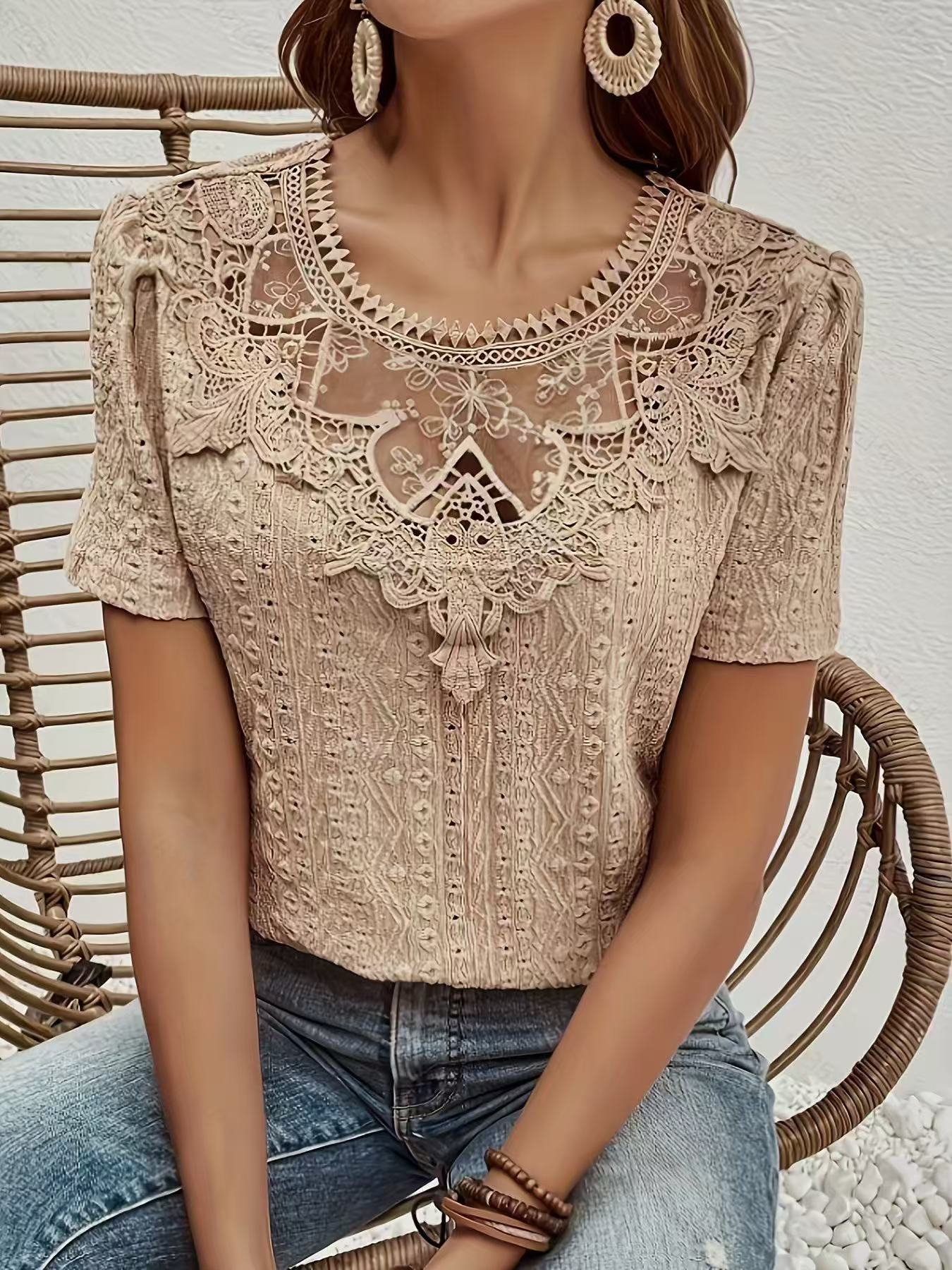 Women's Stitching Bow Tie Solid Color Hollow Round Neck Lace Short Sleeve