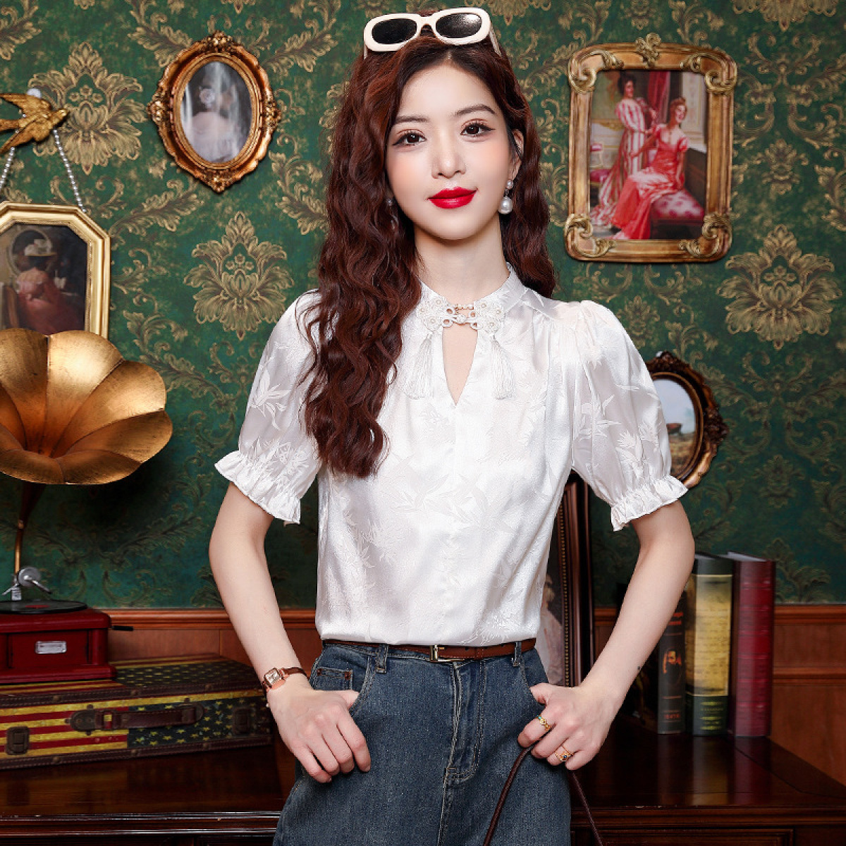 Real Shot New Chinese Style Retro National Style Buckle Jacquard Shirt For Women