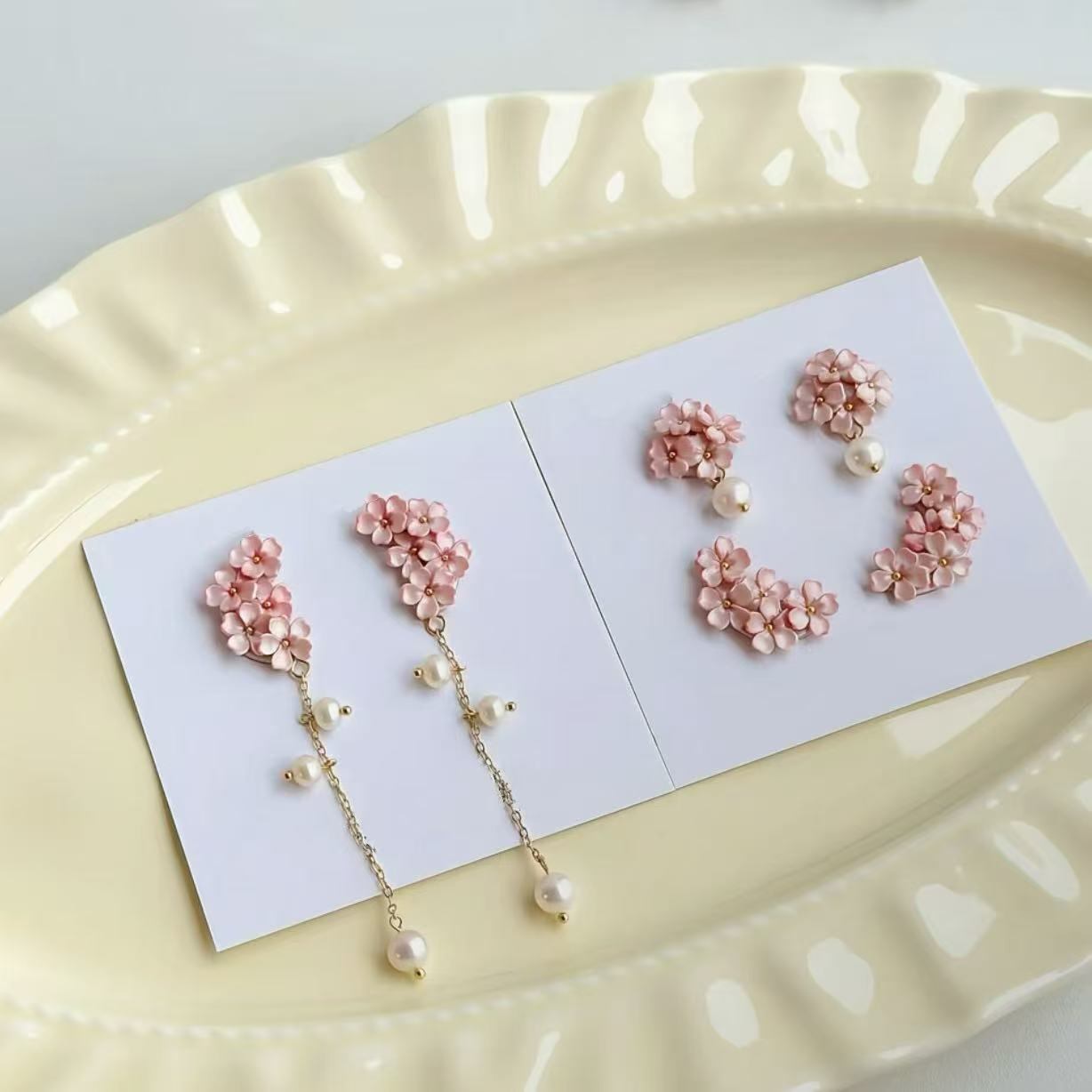 Color: MZ-00534 pink cherry blossom asymmetric ear studs, MZ-00534 pink cherry blossom short ear studs, MZ-00534 pink cherry blossom long fringe ear studs, MZ-00534 a bunch of pink cherry blossom ear studs, MZ-00534 pink cherry blossom asymmetric triangle ear clips, MZ-00534 cherry blossom short triangle ear clips, MZ-00534 pink sakura tassels long triangle ear clip, MZ-00534 a bunch of pink cherry blossom triangle ear clip