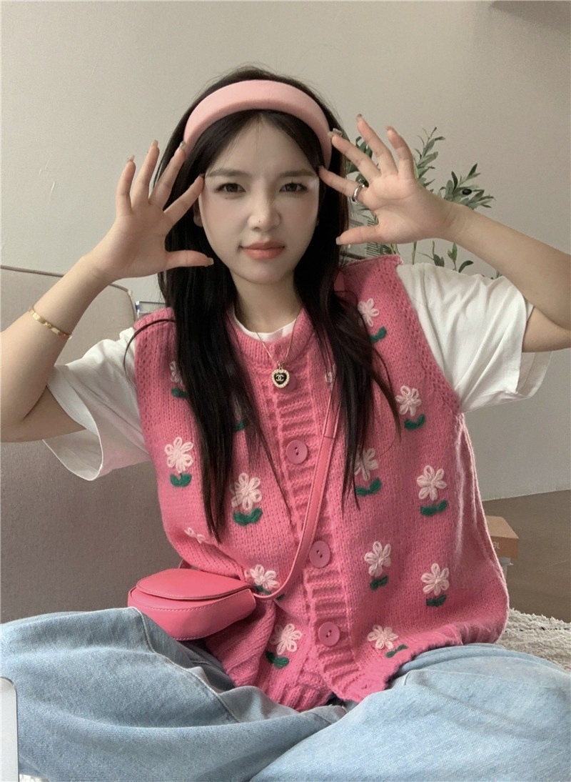 Embroidery Flower Knitted Vest Cardigan Sweet Sweater