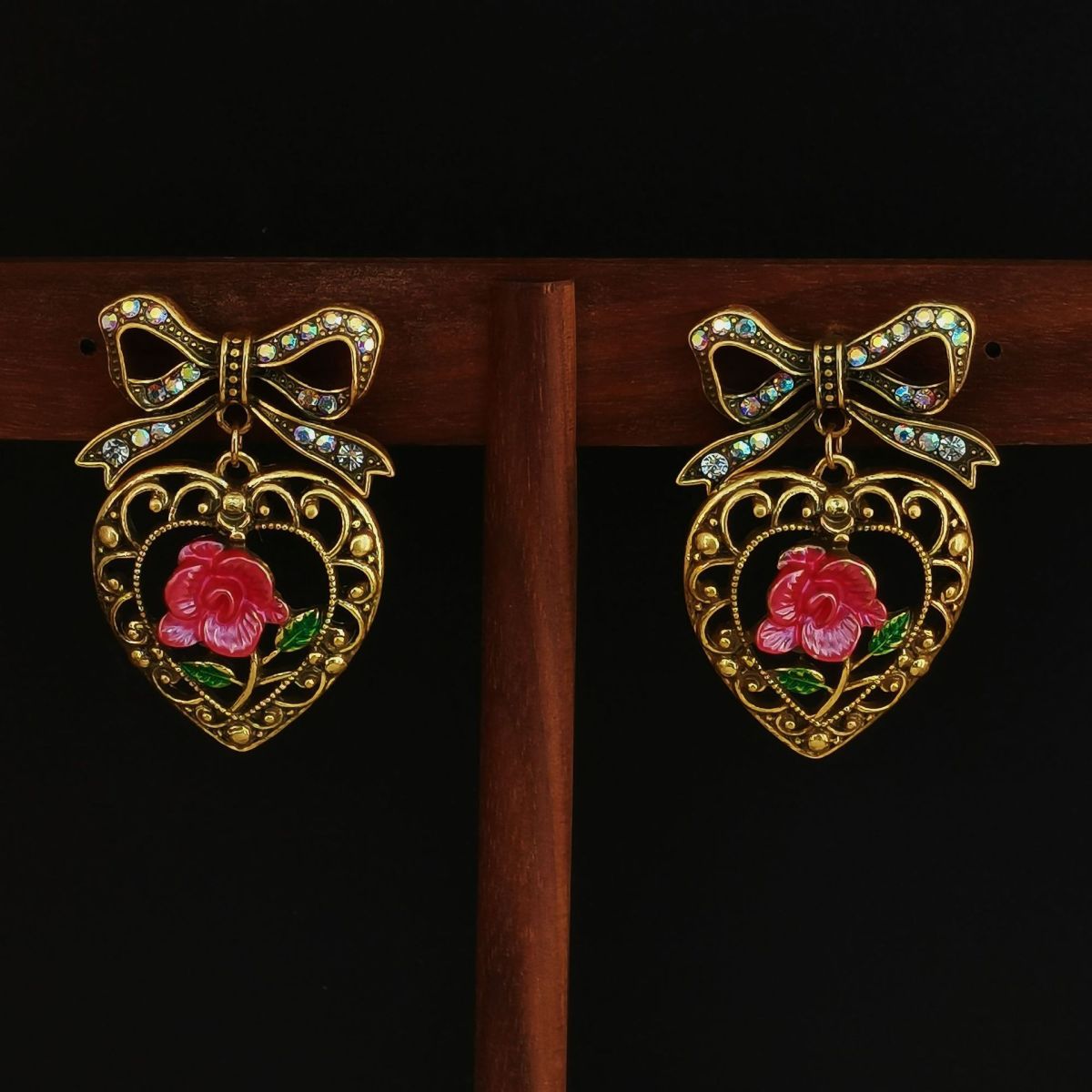 Inlaid Zirconium Bow Hollow Pattern Love Heart Rose Eardrop Earring