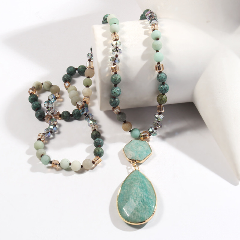 Natural Stone Glass Knotted Necklace Hexagonal Water Drop Stone Pendant Necklace