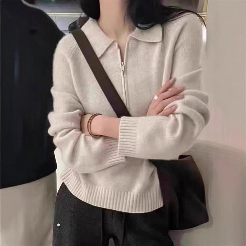 Lapel Half Zipper Solid Color Sweater For Women Loose Pullover