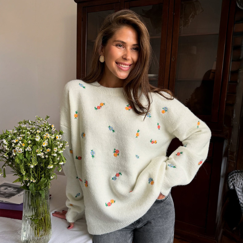 Crew Neck Pullover Embroidered Flower Sweater