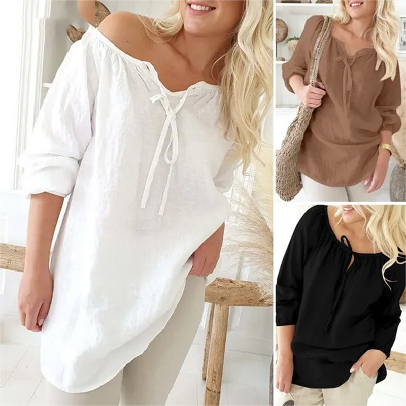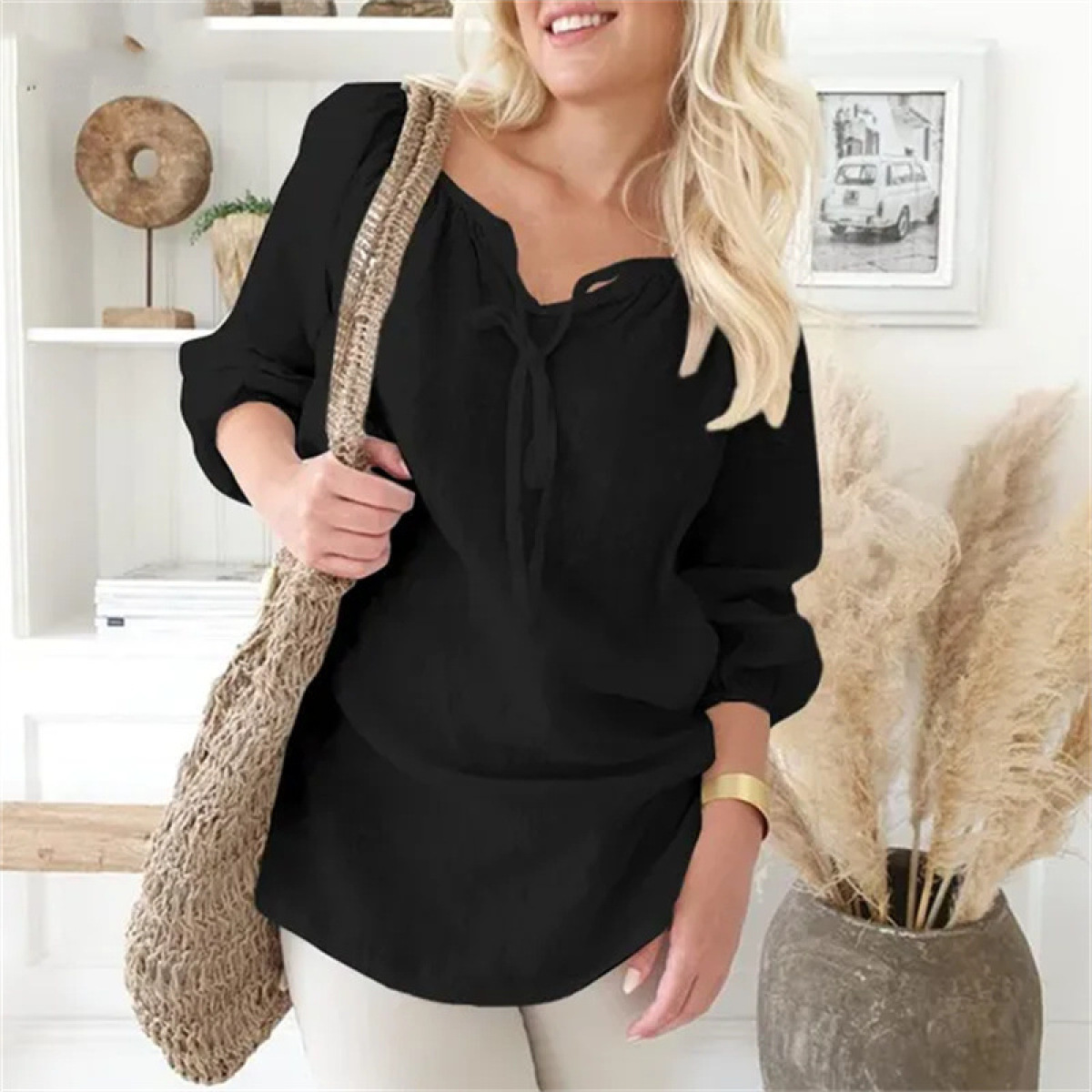 Women's V-neck Loose Lace-up Cotton And Linen Shirt
