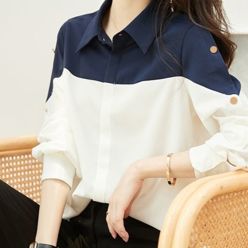 Long Sleeve Chiffon Shirt Loose Polo Collar Top For Women
