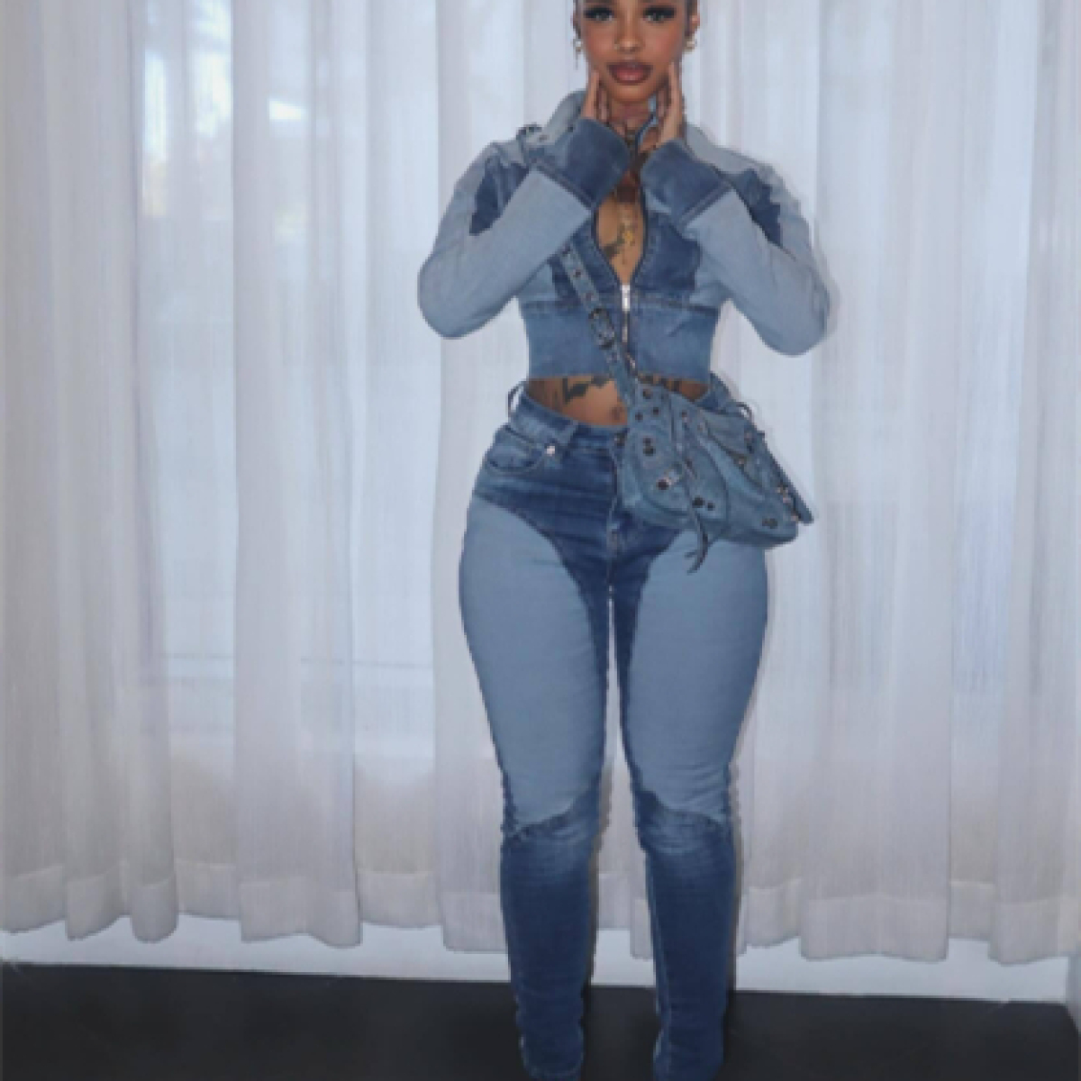 High Elastic Stitching Contrast Color Washed Denim Casual Suit Two-piece Set