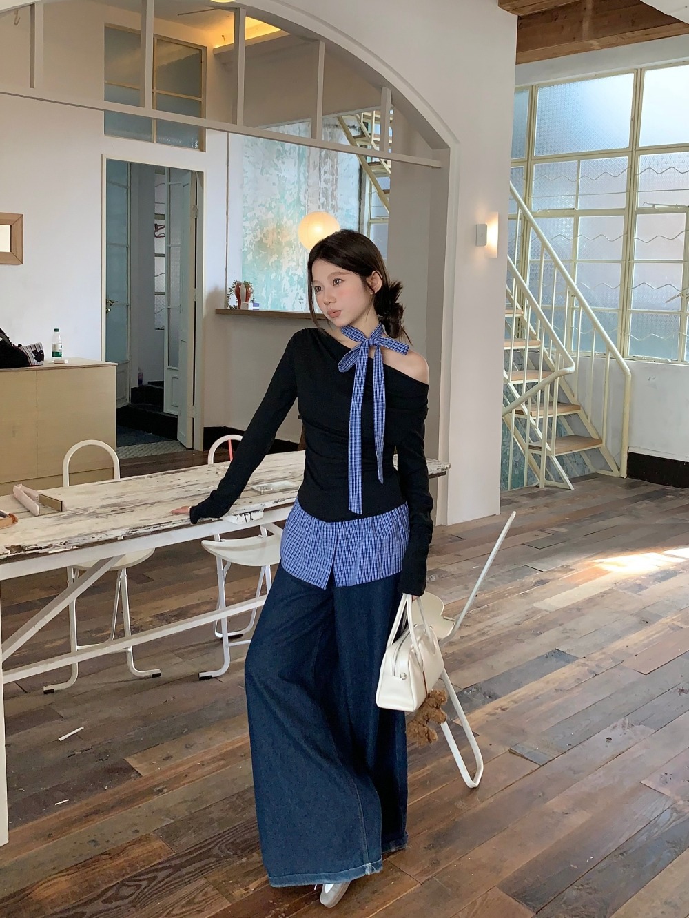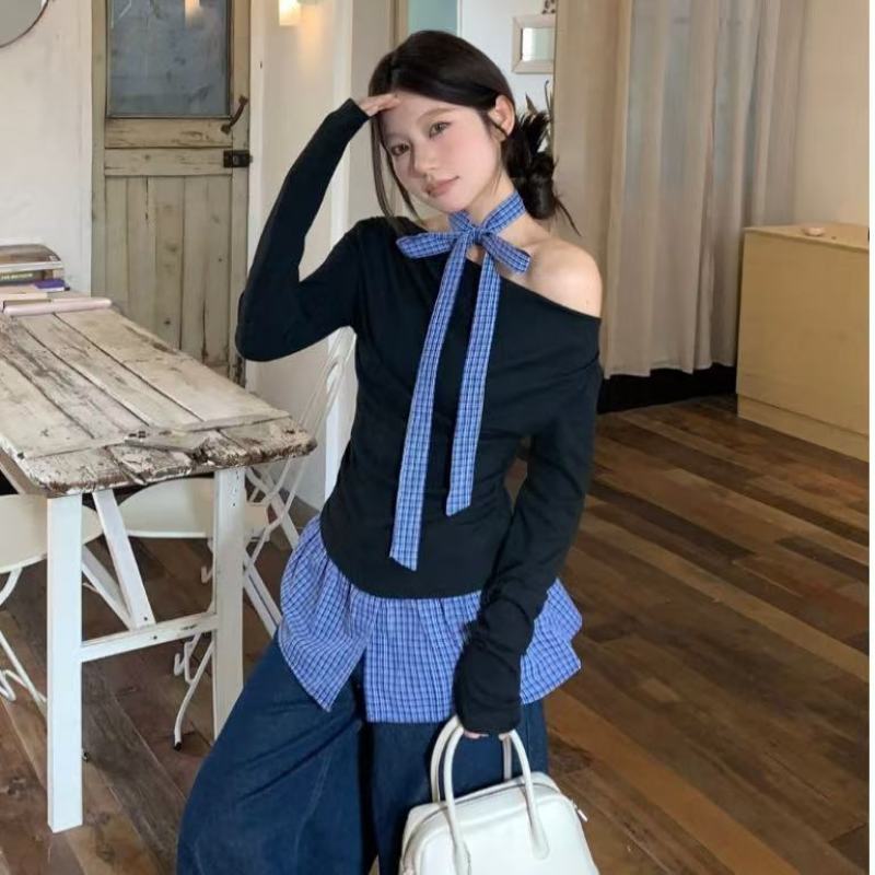 Women's Fake Two-piece Grid Off-shoulder T-shirt