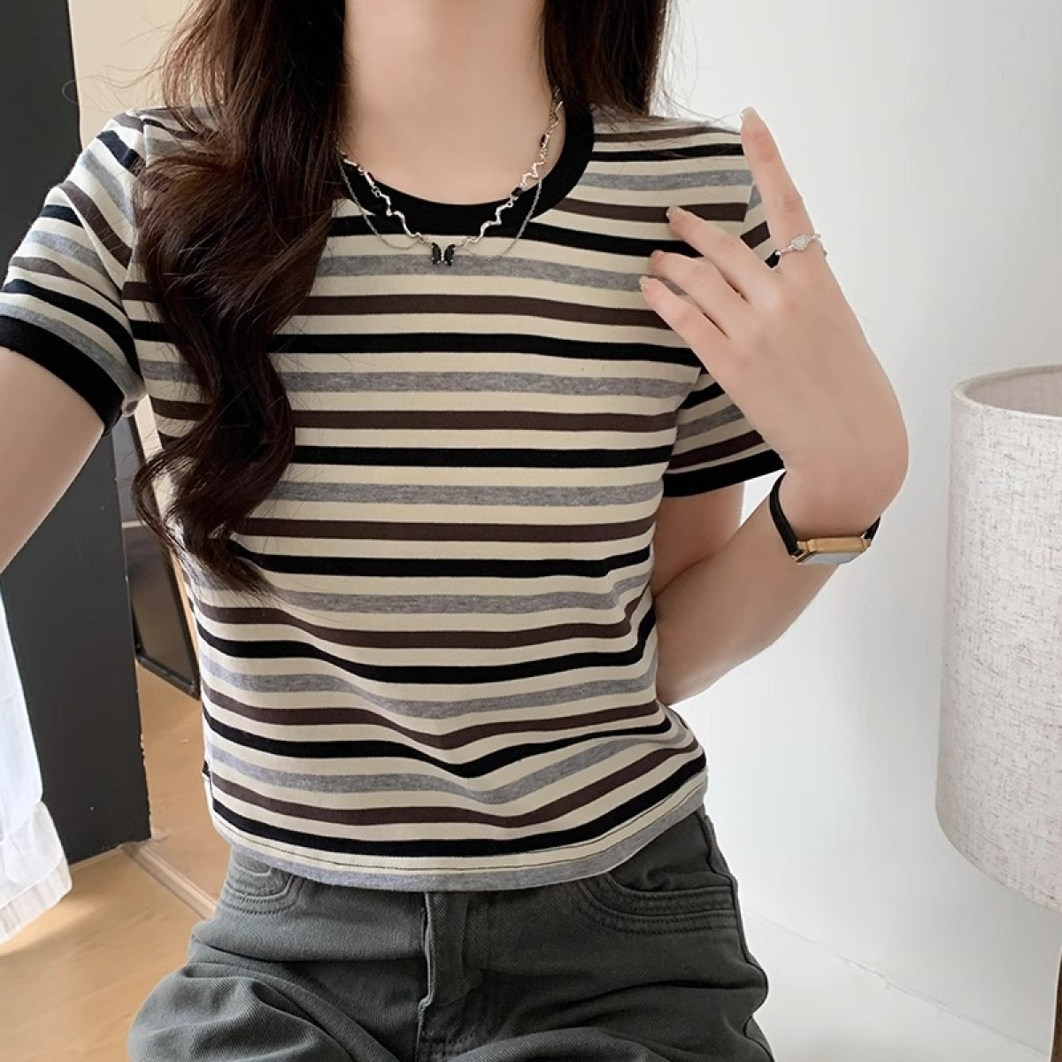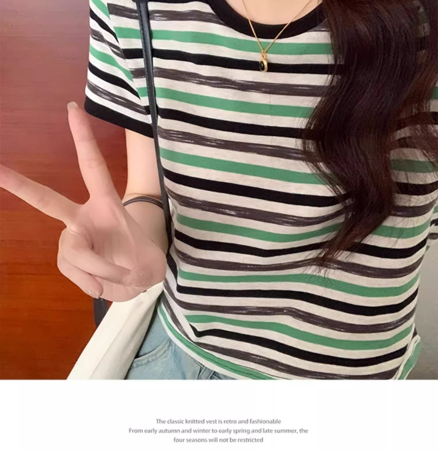 Women's Green Striped Regular-fit Slim Short-sleeve T-shirt