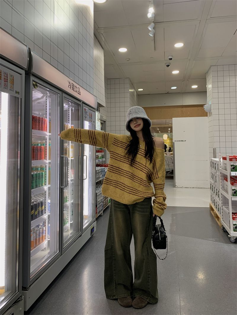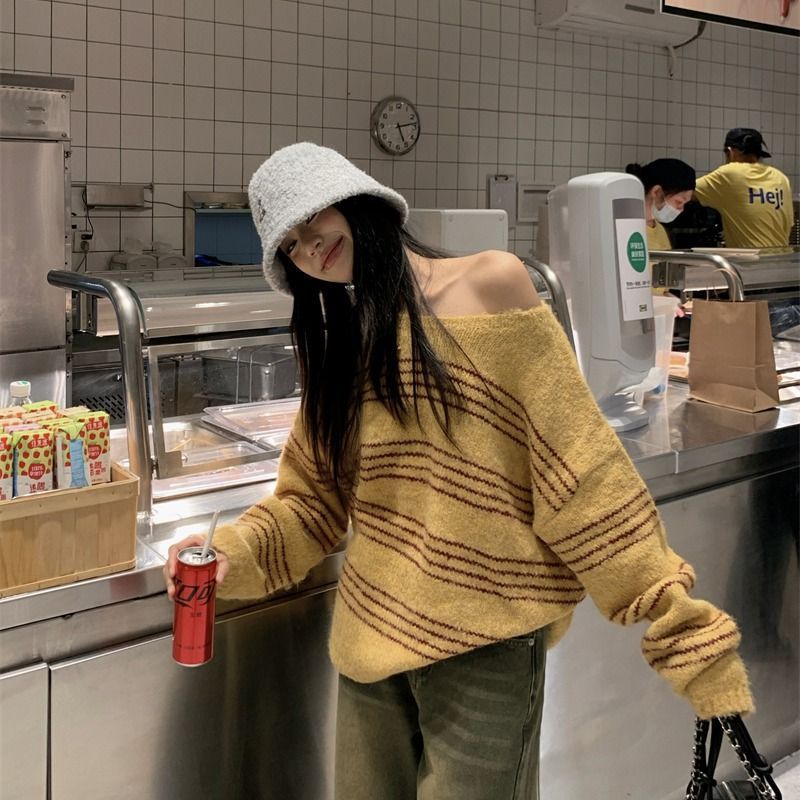 Lazy Style Striped Color-blocking Off-shoulder Knit Sweater Women's New Springautumn Style