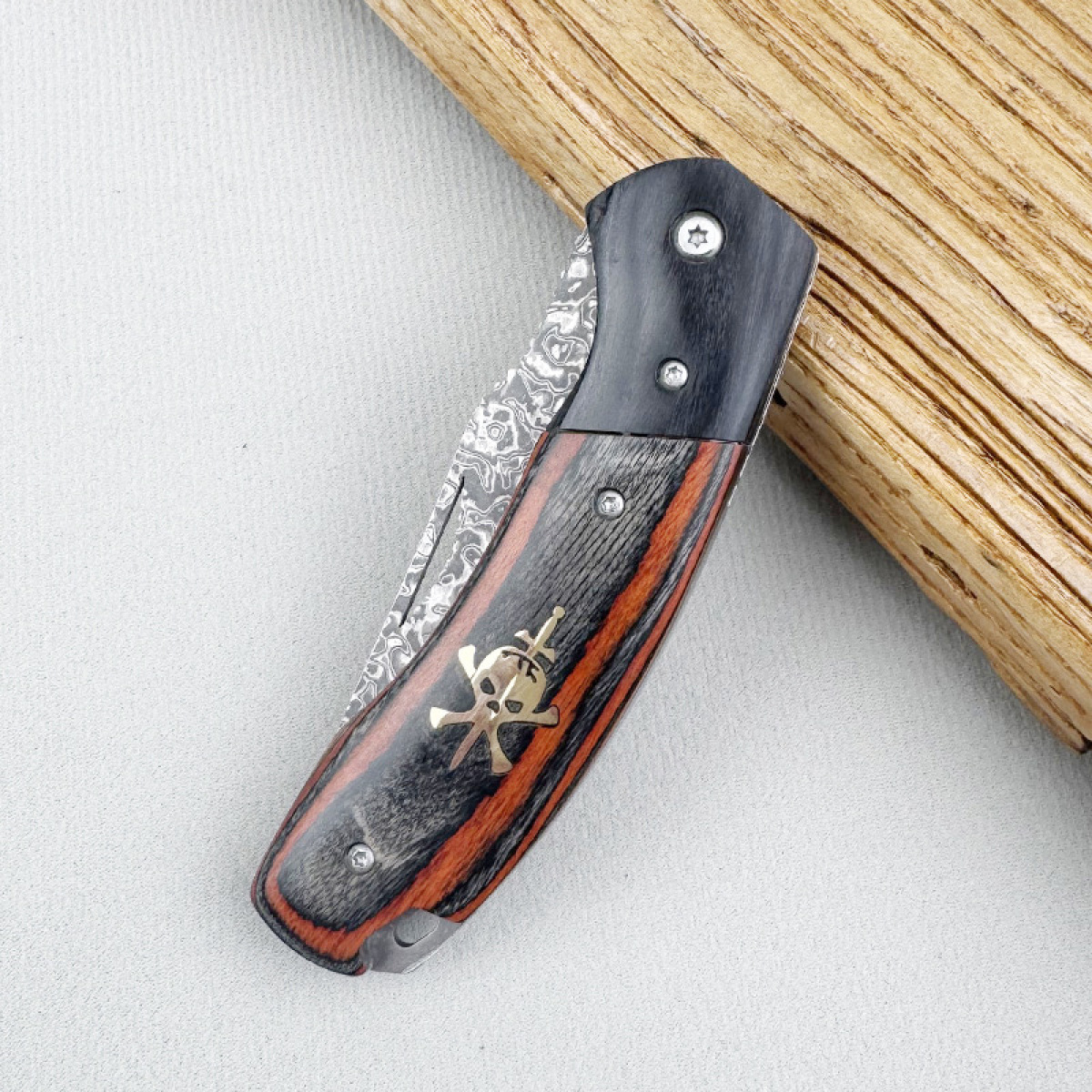 Handle: Colored wood + copper head inlay