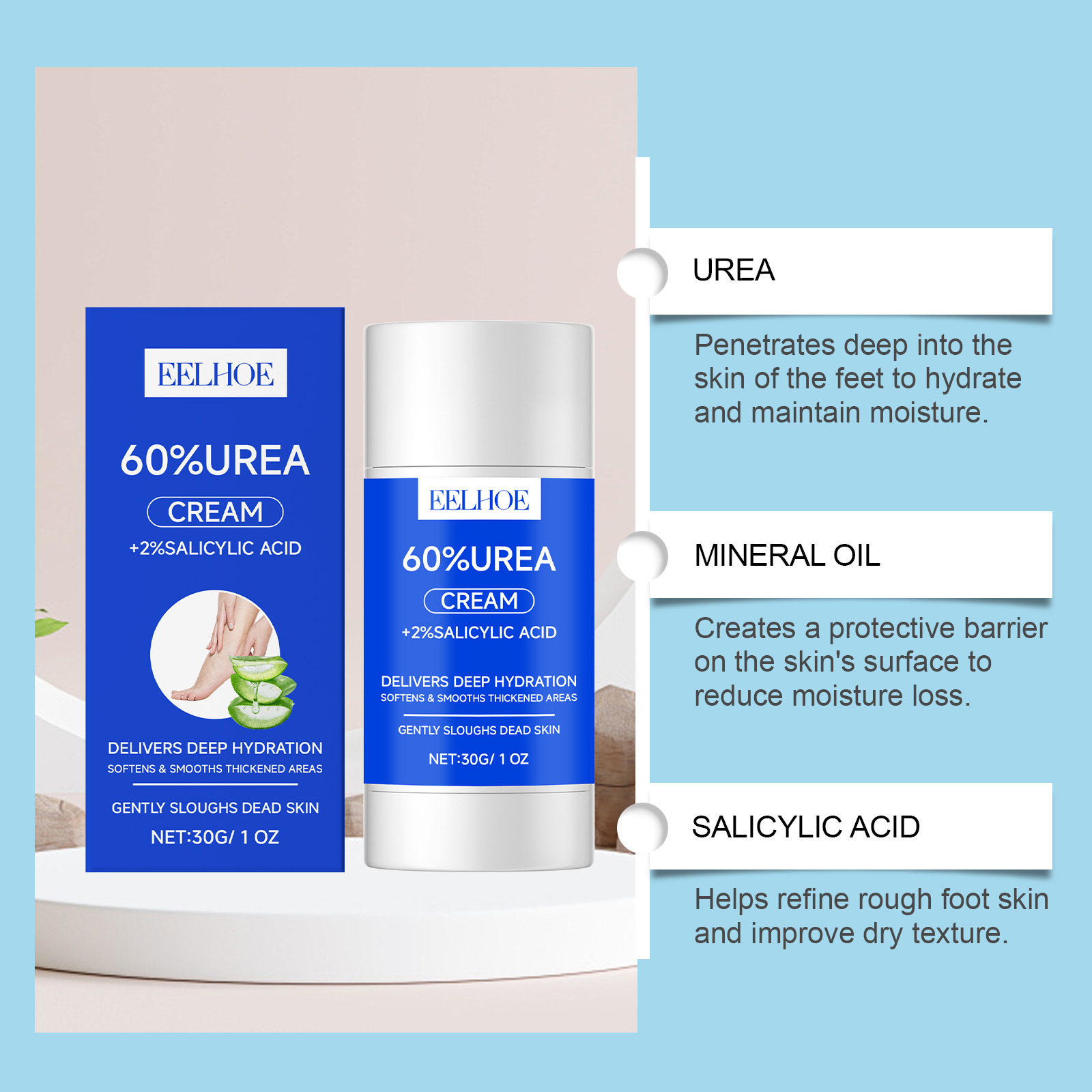 Ingredients: urea, mineral oil, beeswax, petrolatum, salicylic acid, tocopherol (vitamin E), aloe vera extract, shea butter fruit extract.