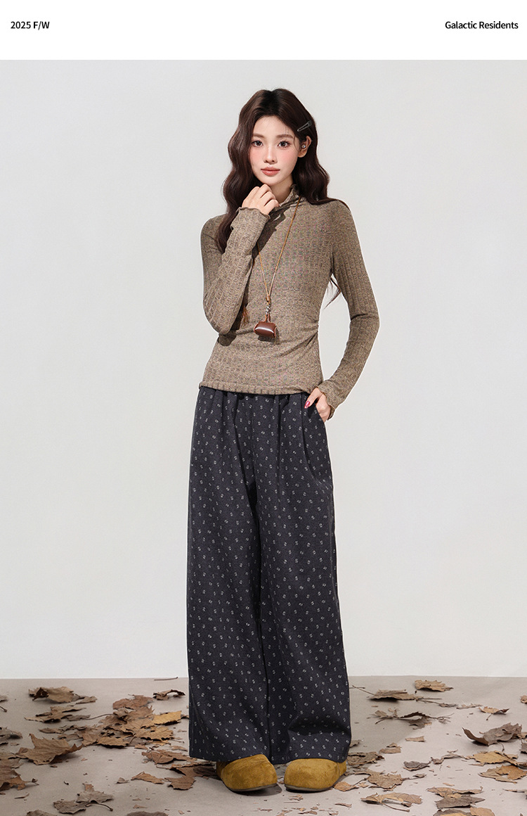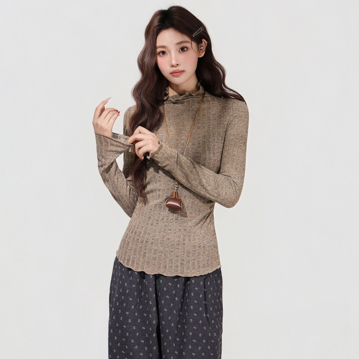 Women's Brown Semi-high Neck Ruffled Waist-cinching Long-sleeved Base Shirt