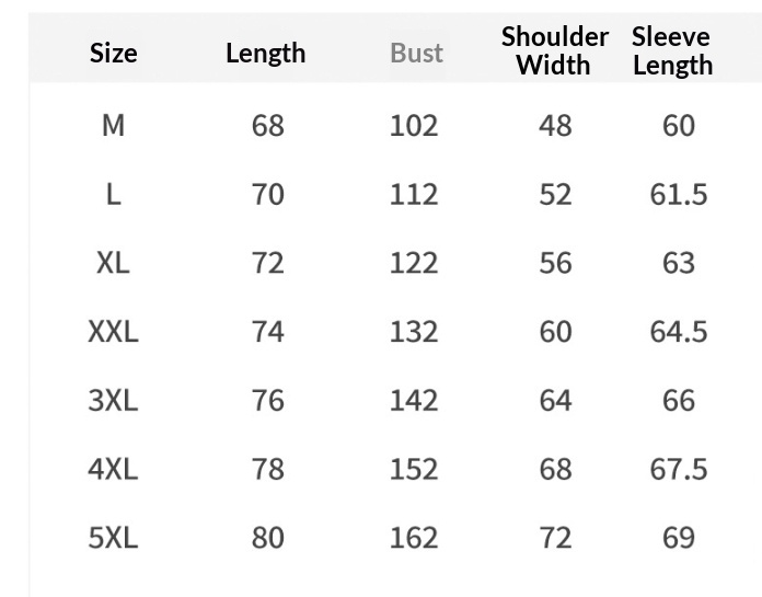 Sizes: M (European size), L (European size), XL (European size), XXL (European size), XXXL (European size), XXXXL (European size), XXXXXL (European size)