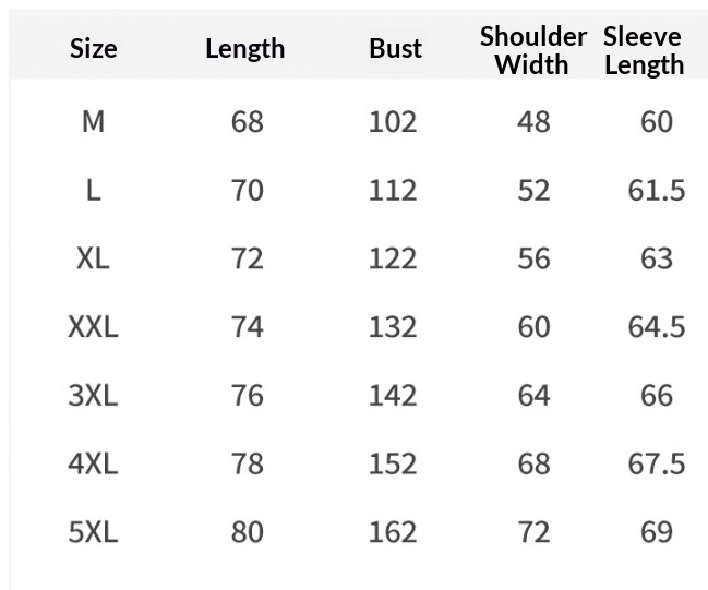 Sizes: M (European size), L (European size), XL (European size), XXL (European size), XXXL (European size), XXXXL (European size), XXXXXL (European size)