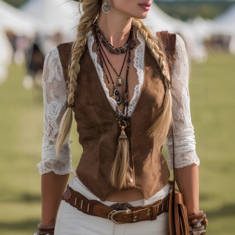 Designer Lace-spliced Faux Two-piece Top