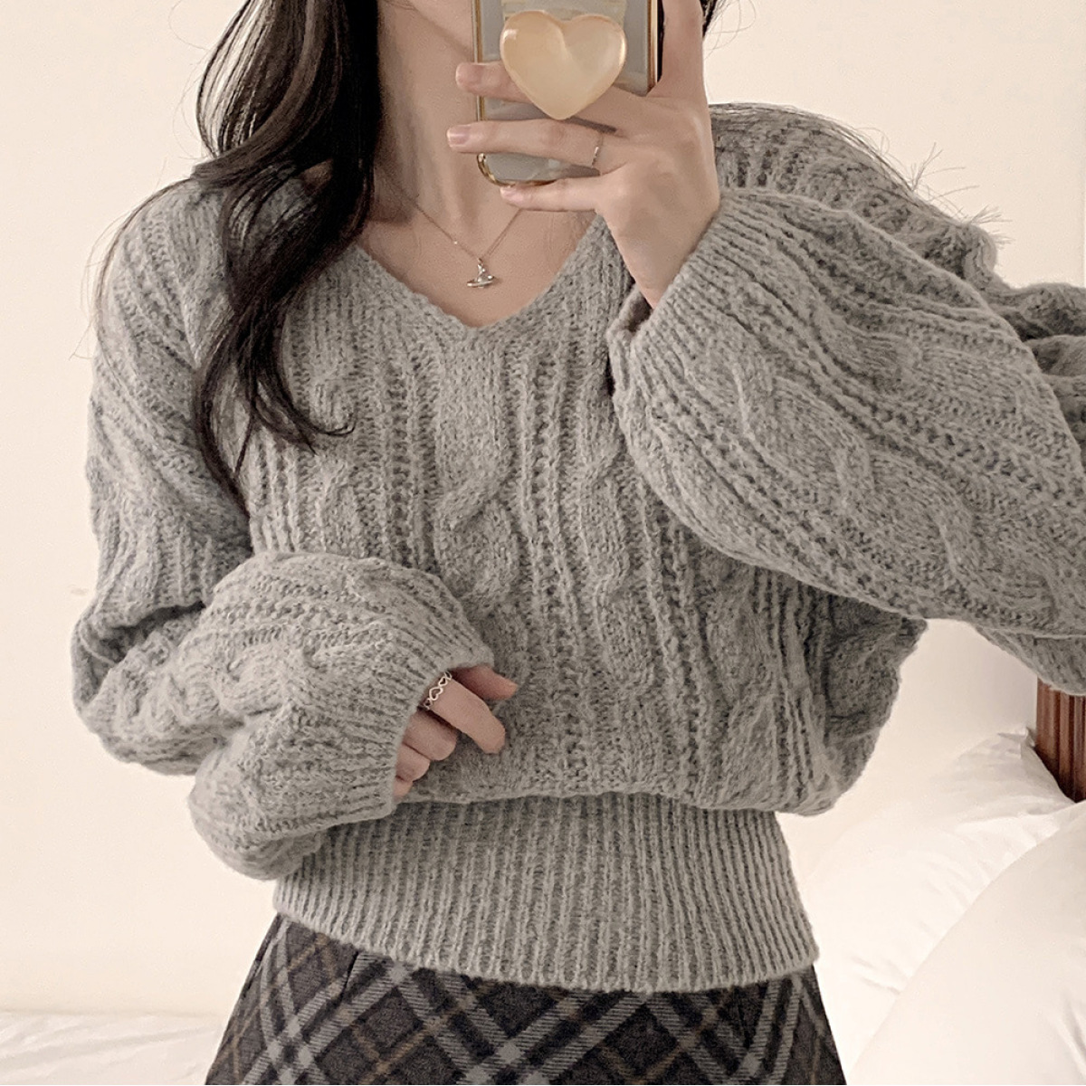 New Korean-style Relaxed-fit Solid-color Cable-knit Sweater With Lantern Sleeves