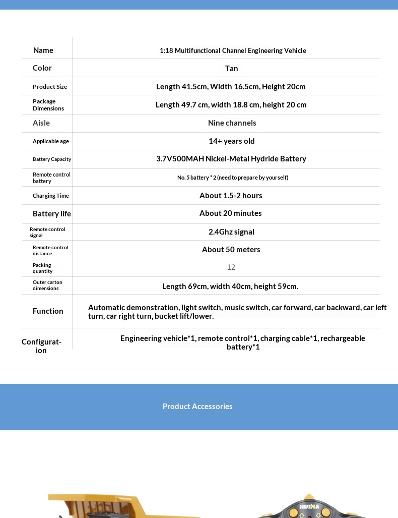 Engineering Vehicle *1, Remote Control *1, Charging Cable *1, Body Battery *1
