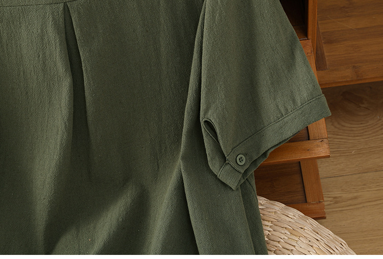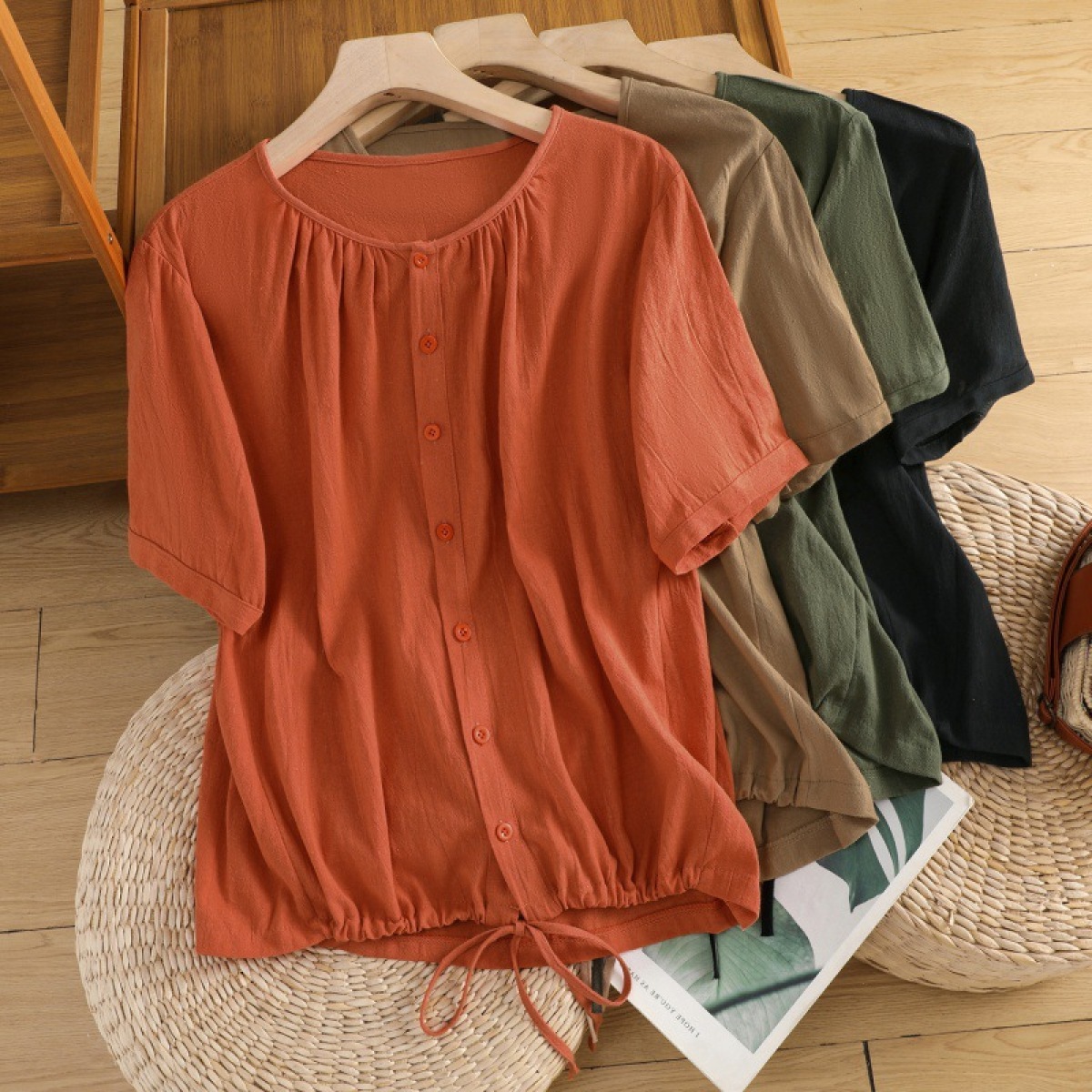 Womens Retro Drawstring Swing Sand-Washed Linen Top With A Crew Neck