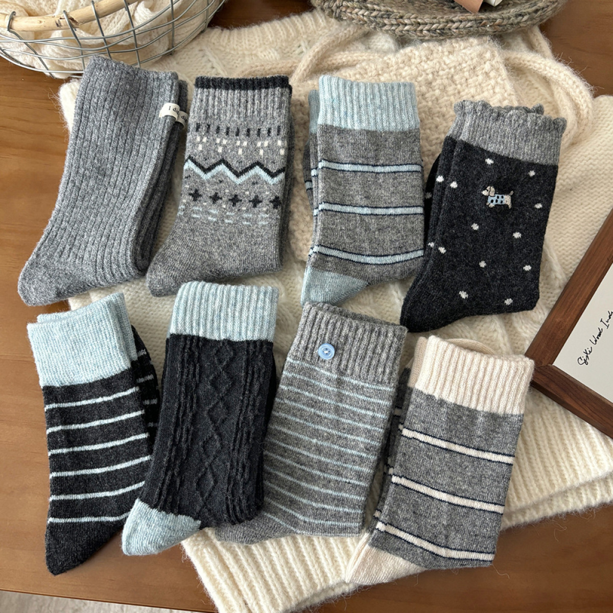 Color: Fabric label, Fair Isle gray, black and gray stripes, buttons, embroidered puppy, dark gray diamond pattern, light gray stripes