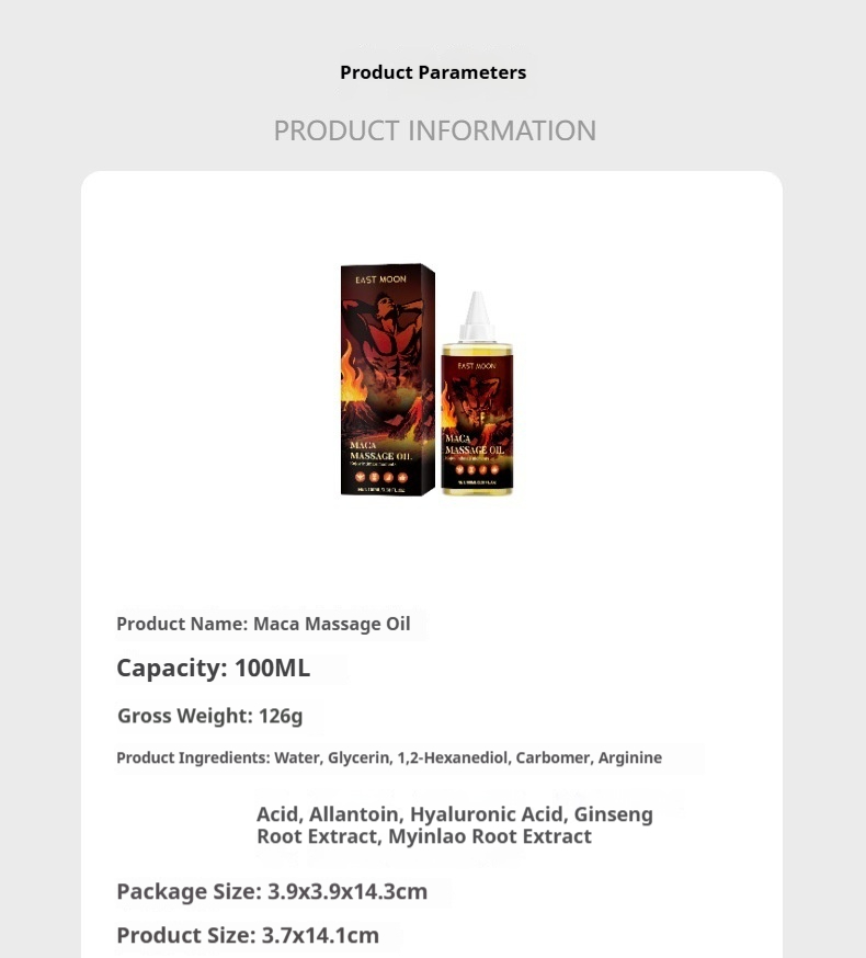 Ingredients: water glycerin 1,2- hexanediol carbomer arginine allantoin hyaluronic PANAX GINSENG root extract LEPIDIUM MEYENII root extract.