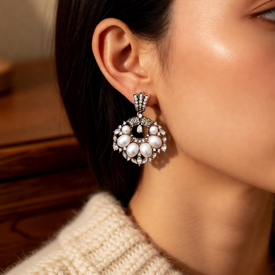 Womens Round Pearl Earrings With Silver Needle And Diamond Inlay