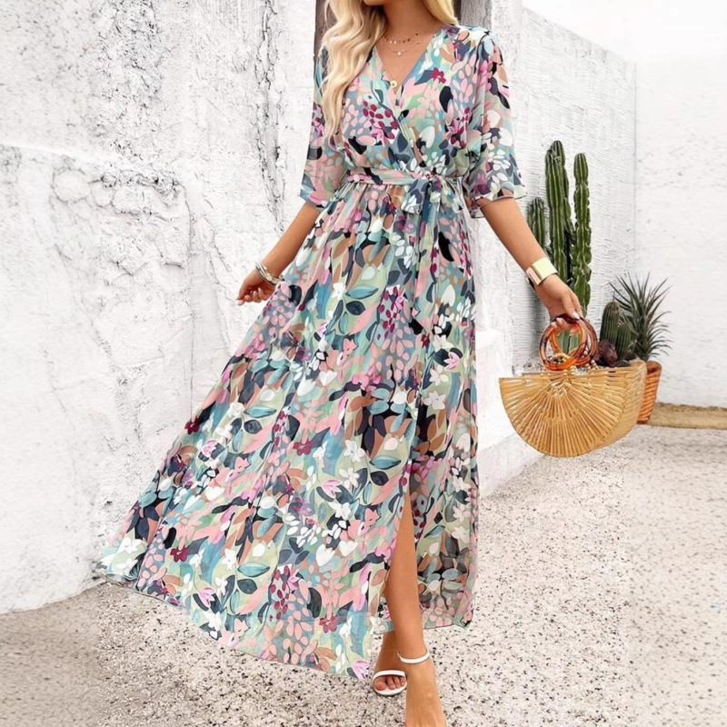 Elegant Chic Printed Lace-up Split Dress