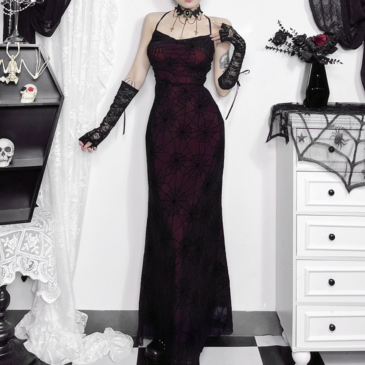 Dark Sensual Spiderweb Backless Dress With A Halter Neckline