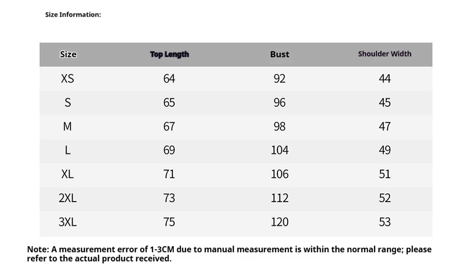 Sizes: XS, S, M, L, XL, XXL, XXXL