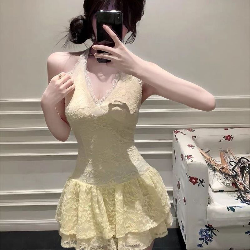 Colors: Black belted coat + lace dress [two-piece set], lace dress [single piece], black belted coat [single piece]