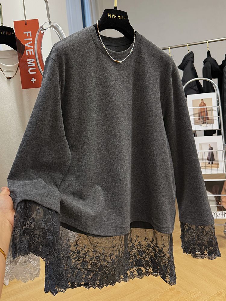 Lace-sleeved Long-sleeve T-shirt Loose-fitting Plus-size Mid-length Base Layer With Brushed Fabric
