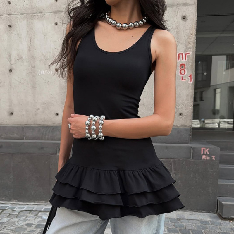 Black Mid-length Sleeveless Tank Top With A Tiered Cake Skirt