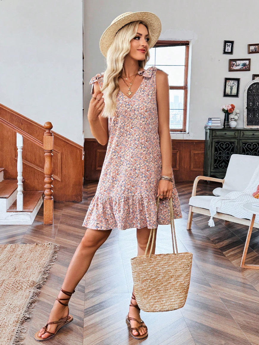 SpringSummer New V-Neck Bow-Knot Floral Tank Dress