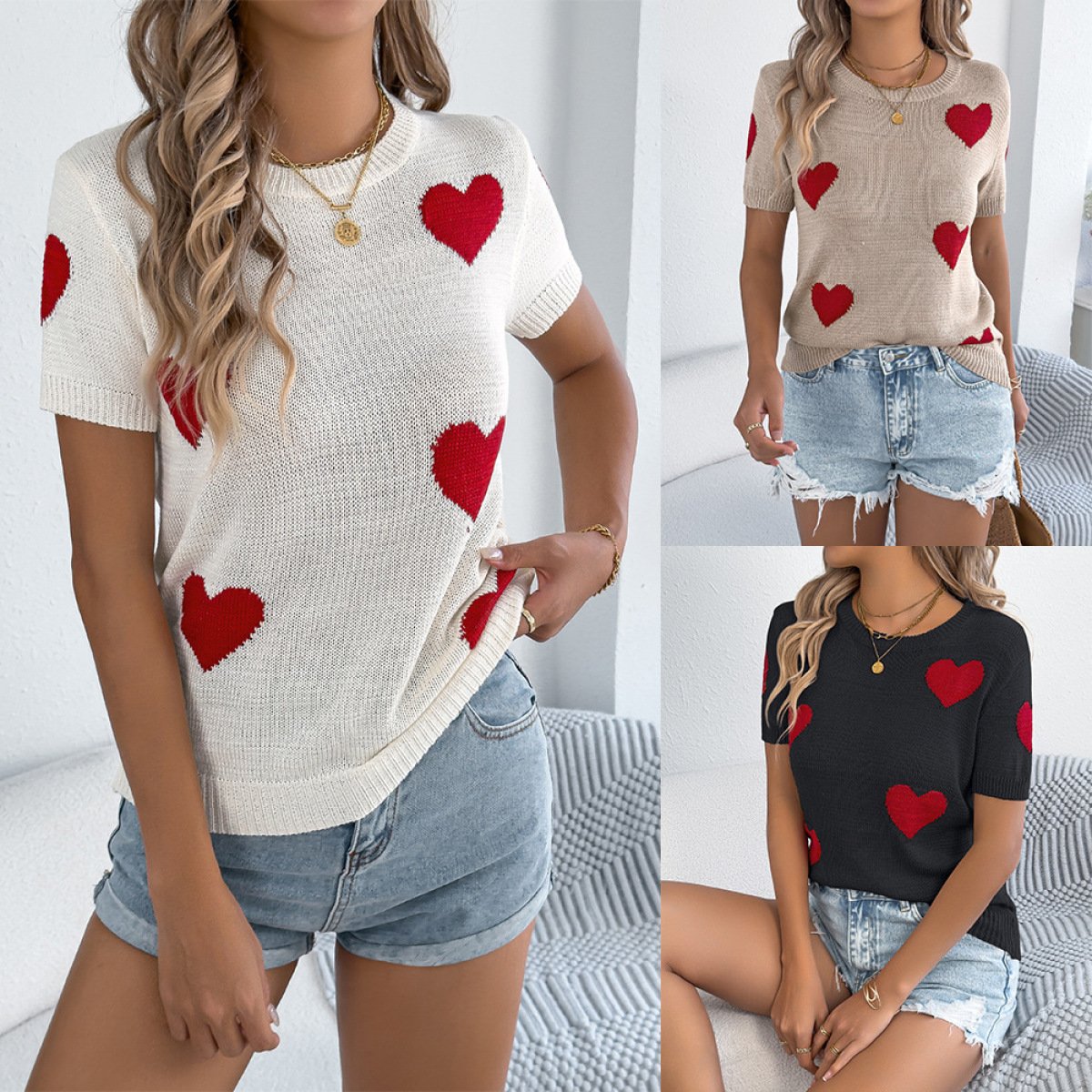 Casual Contrasting Color Heart-Shape Short-Sleeve Knit Top