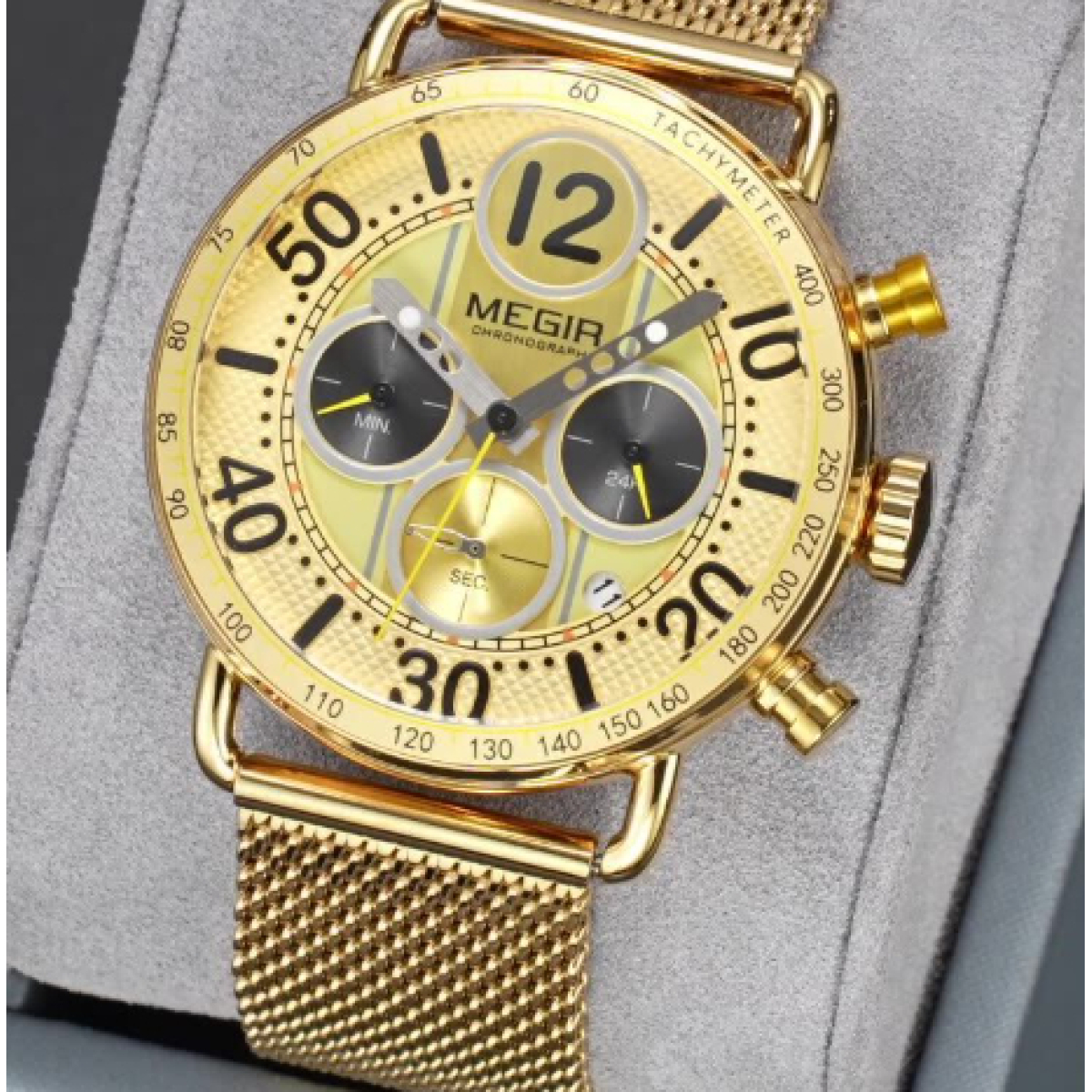 Color: Gold case, gold bezel, gold dial, gold mesh band; gold case, green bezel, gold accents with green dial, gold mesh band; gold case, white bezel, gold accents with white dial, gold mesh band; gold case, black bezel, gold accents with black dial, gold mesh band; gold case, sky-blue bezel, gold accents with sky-blue dial, gold mesh band (around March)