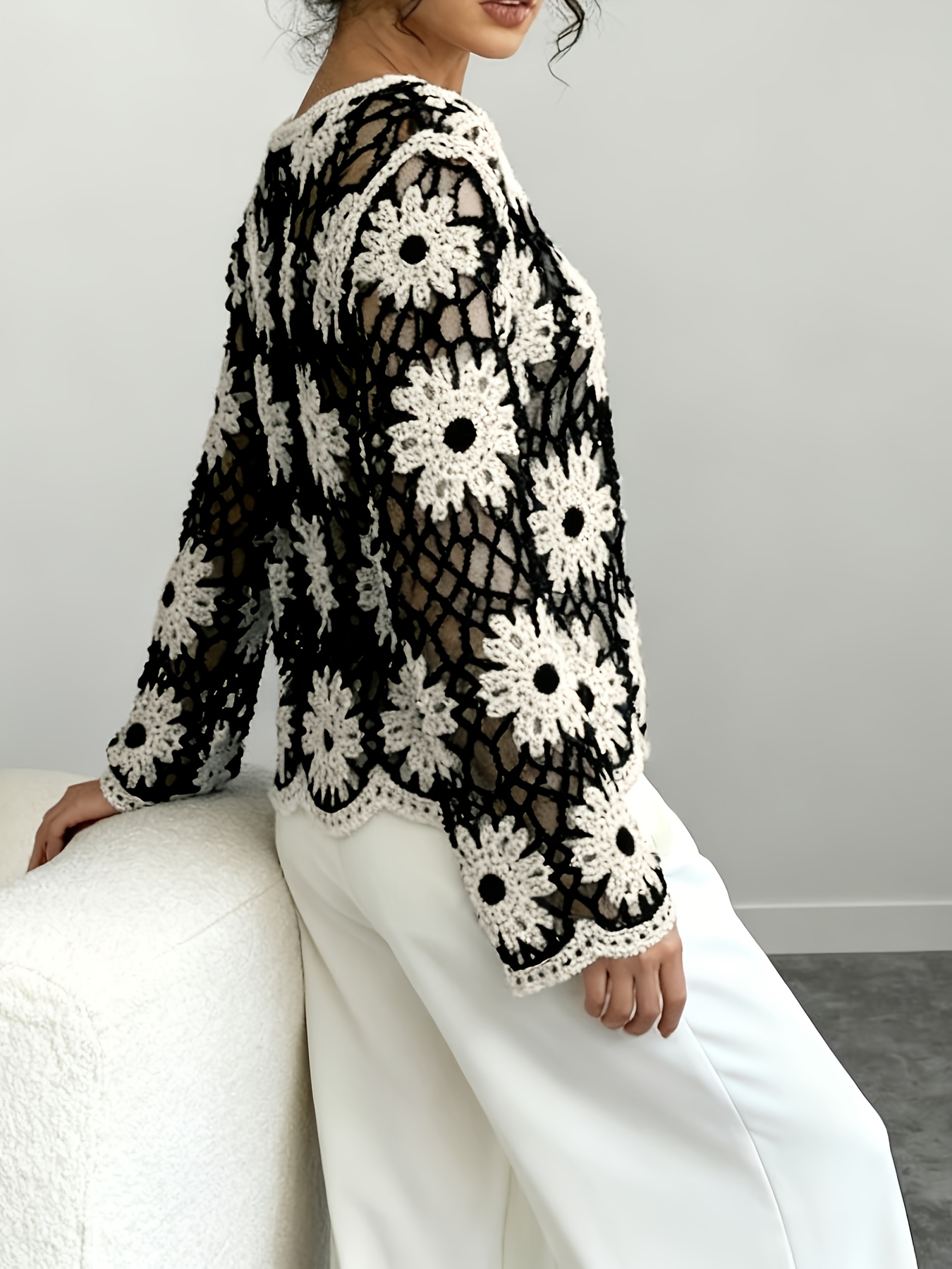 Womens Crochet Hollow-Out Knitted Pullover Top With Long Sleeves
