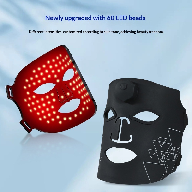Colors: Photon skin-rejuvenation mask device, iridescent black wave-pattern mask, iridescent white-and-green mask, iridescent white-and-pink striped mask, iridescent white-and-blue striped mask, iridescent white-and-purple striped mask.
